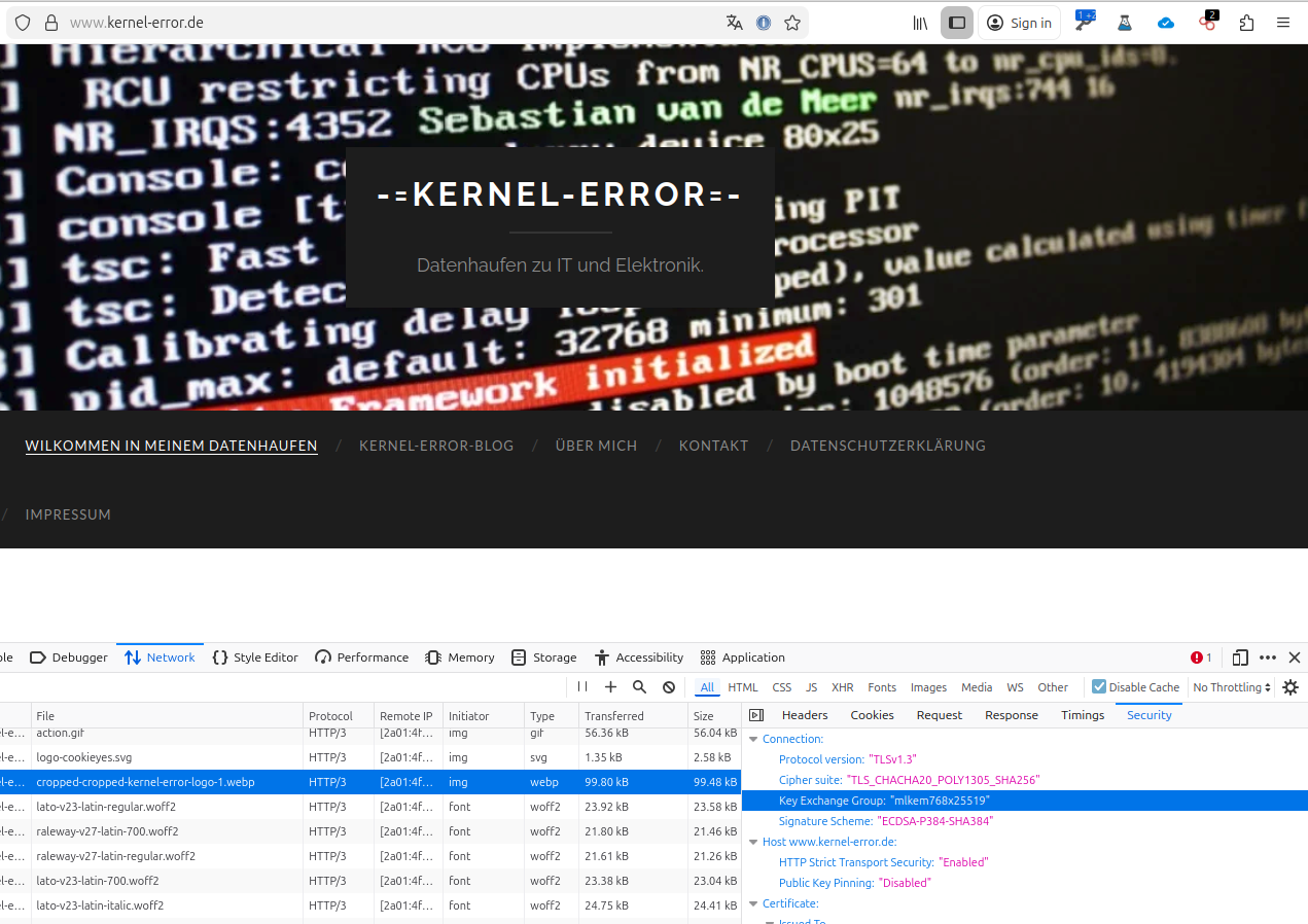 Ein praktisches Beispiel ist der Schlüsselaustausch mlkem768x25519. Wenn ihr diese Seite nicht gerade über Tor lest, ist die Wahrscheinlichkeit hoch, dass euer Browser bereits eine solche hybride, post-quantum-fähige Verbindung nutzt. Im Firefox lässt sich das einfach prüfen über F12, Network, eine Verbindung anklicken, dann Security und dort die Key Exchange Group. Taucht dort mlkem768x25519 auf, ist die Verbindung entsprechend abgesichert.